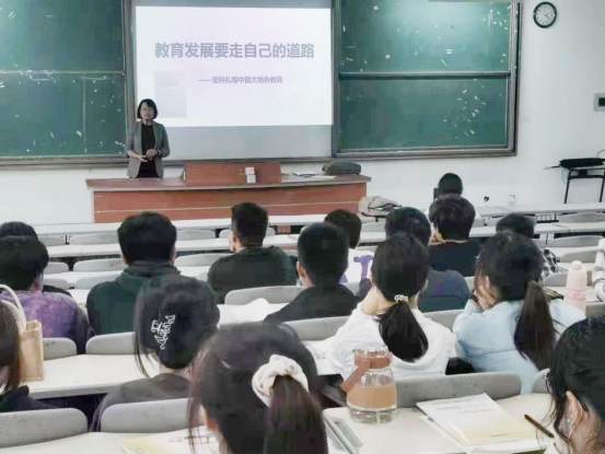 从中国特点切入,郑苏青副书记配合历史、文化、国情,向大家讲述了如何发展具有中国特色、世界水平的现代教育。郑苏青副书记表示,坚持中国特色社会主义教育发展道路,要“扎根中国,融通中外”,以我为主,兼收并蓄;要“立足时代,面向未来”,紧扣时代主题,兼顾现实未来。结合自身的理解,郑苏青副书记将繁琐枯燥的教育知识转化为生动有趣的话语,让大家明白了教育的规律、人才成长规律以及如何才能实现人的全面发展。