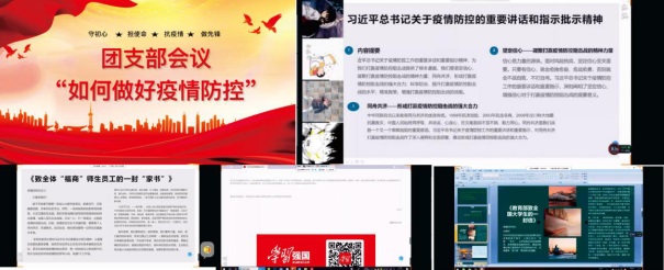 在此次主题团课活动中,各团支部首先重点学习了:习近平总书记关于疫情防控的重要讲话和指示批示精神;《共青团中央关于坚持党的领导,全团动员,在防控疫情阻击战中充分发挥共青团生力军和突击队作用的通知》、《致全体“福商”师生员工的一封“家书”》等疫情防控通知。紧接着,各团支部以“如何做好防控”、“对疫情的影响进行探讨”等主题,通过PPT学习、观看抗“疫”视频等方式进行防控疫情相关内容的学习,加深了对新型冠状病毒防控的认识。最后,各团支部围绕“在此次抗‘疫’中青年人应如何做?”展开讨论,同学们纷纷表示会贯彻学校“停课不停学”的精神认真学习,不造谣、不信谣、不传谣,做好防护措施,积极参与抗疫志愿活动。