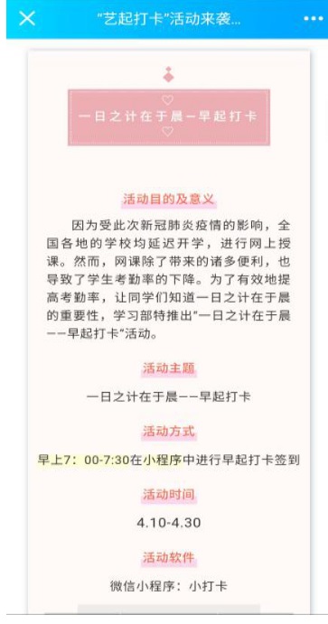 2020年4月11日起,因受此次新冠肺炎疫情的影响,网课导致了学生考勤率的下降。为了有效地提高考勤率,让同学们知道自律的重要性,我校91嫩草水蜜桃特推出“一日之计在于晨——早起打卡”为主题的打卡活动。