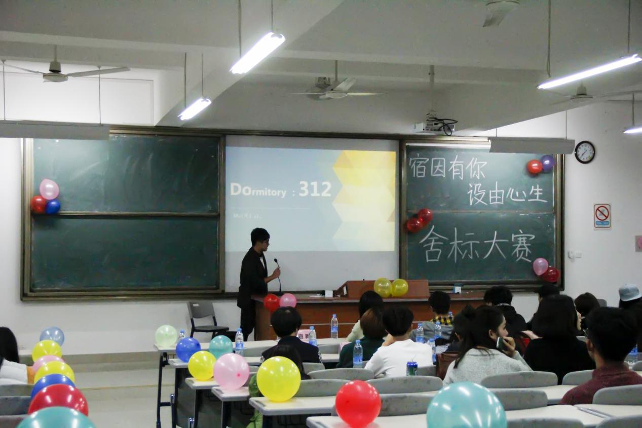 各参赛队伍按抽签顺序依次上台展示自己的参赛作品。大家的舍标设计各具特色,结构或灵动活泼、或古典淡雅、或诙谐可爱,节能环保的绿色理念贯穿其中,流畅的线条勾勒出同学们对宿舍小家庭的热爱。各宿舍代表结合精心制作的ppt,声情并茂地向观众们讲解舍标的创意来源与蕴含的宿舍文化,展示了宿舍独特风采,并对宿舍寄予美好祝福。中场时,由艺术团曲艺队的同学献唱了一首《背对背拥抱》,在动听的歌声带动下,全场气氛达到了高潮。经过比拼,1 #312宿舍获得大赛一等奖,1 #317、1#321宿舍获得二等奖, 1#323、3#134宿舍获得三等奖,1#308、3#135、等宿舍获得优秀奖。