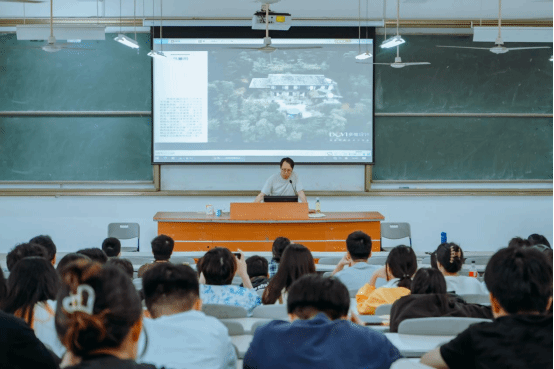 讲座伊始,林洲老师通过具体案例具体分析,展示案例各区域效果图,分享如何营造环境,教导学生们在设计中要注意融合当地文化,顺应时代潮流,发挥其环境优势,全方位地展现和诠释设计在不同特点的乡村中的新变化、新气象、新内涵。随后,林洲老师从多维度让同学们认识艺术设计的魅力,指出艺术同样可以在乡村振兴领域有所作为。