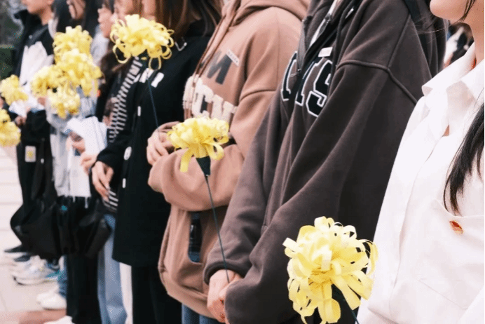 师生们为烈士献上自己亲手制作的菊花