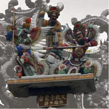 林陈玲:在本次实地考察的过程中,我对当地剪瓷雕的艺术形象来源有了更多的了解。起初我见到的大部分剪瓷雕大多主题恢弘,多是龙凤。而在实地考察的过程中,我还发现了许多结合了其他生活内容衍生而来的剪瓷雕作品。如屋檐下的红色锦鲤象征好运富足,通过剪瓷雕的形式,表现了当时人们对生活美好向往。在考察的同时,也见到了许多其他的当地人对生活的愿景以不同民族信仰的传说形象通过剪瓷雕的形式表达出来,让我对传统文化有了更深的理解。