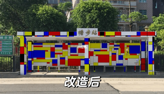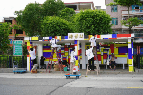 实践队对东岱镇蟾步公交车站进行改造,将艺术墙绘融入乡村基础设施,展现乡村新风貌。实践队通过对蟾步站周边的环境进行考察与多番探讨,以蒙德里安风格为基调,将蟾步村的田园河道特色抽象为几何艺术形态的绘画语言,同时融入东岱镇特色IP形象——“咚咚锵”,设计出既具时代感又不失乡土气息的墙绘作品。在高温酷暑下,团队成员不畏艰难。无论是烈日炎炎的白天,还是星光点点的夜晚,他们都坚守在公交站旁,用画笔和颜料为乡村增添色彩。他们的身影在柔和的灯光下拉长,与周围静谧的夜晚形成鲜明对比,绘就了一幅生动展现青春风采与乡村之美的画卷。