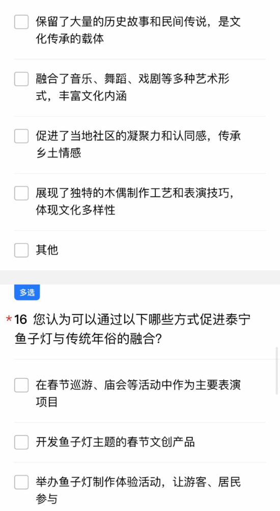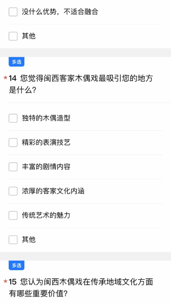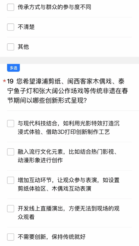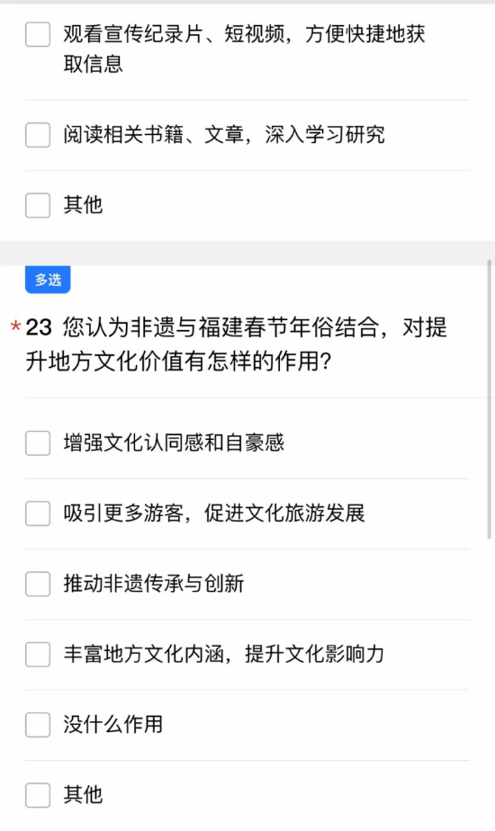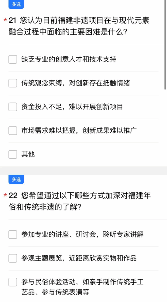 为了解不同地区与年俗有关的非遗文化现状,团队结合线下实践成果,设计并发布非遗年俗文化调查问卷,覆盖福建多个地区,收集有效问卷数据。通过文献研究、问卷分析及田野调查相结合的方式,系统梳理非遗技艺的历史脉络与现代价值,形成调研报告及实践成果集,为非遗保护提供参考。