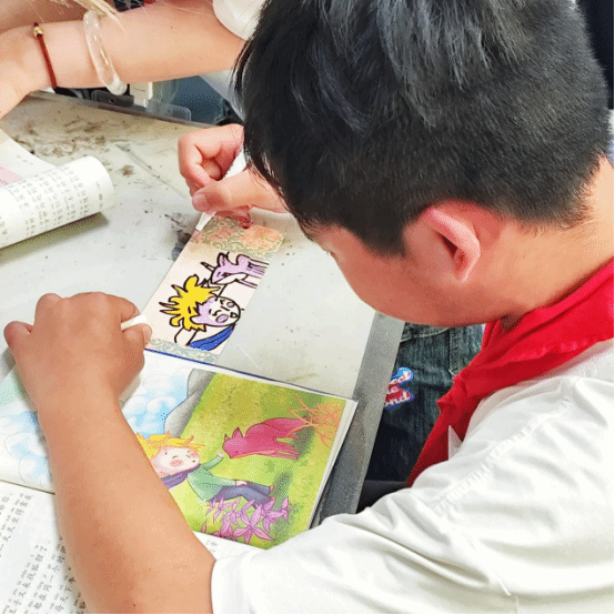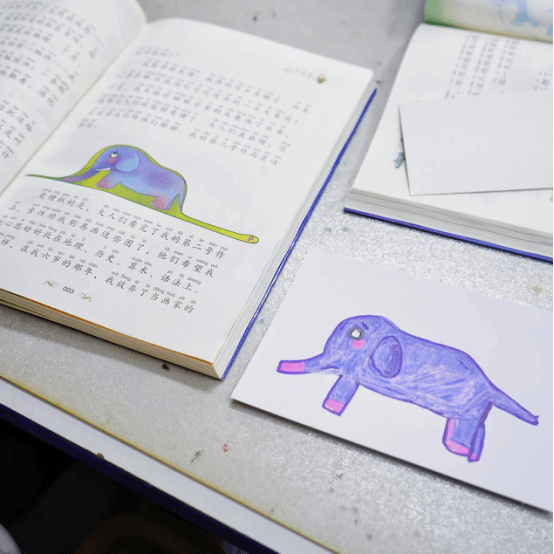为兼顾儿童认知特点与学习偏好,我院读书社特以《小王子》为载体开展书香阅读活动。利用图文并茂的PPT,将“成长与选择”“爱与责任”等主题融入互动问答,孩子们看玫瑰的温柔脆弱心生怜惜;听国王的荒诞独白会心一笑;聊狐狸的驯养哲学由衷赞叹。在正式赠书后,我院读书社社员们与孩子们共同围绕书本,写书签、画插画、悟经典。采取“以画促读”形式,指导孩子们运用“色彩意象”“抽象表现”等技法,将文字叙事转化为视觉语言,帮助孩子们在艺术实践中感悟经典。