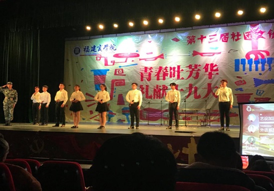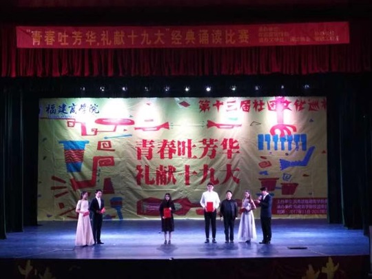 2017年12月12日晚六点半,为歌颂党的伟大成就,增强同学们爱党爱国之情,提高当代大学生的政治觉悟,丰富学生的课余文化生活,福建商学院“青春吐芳华礼献十九大”的诵读比赛在校活动中心举行,本次比赛由我系主持队队员及“女子军”参赛。