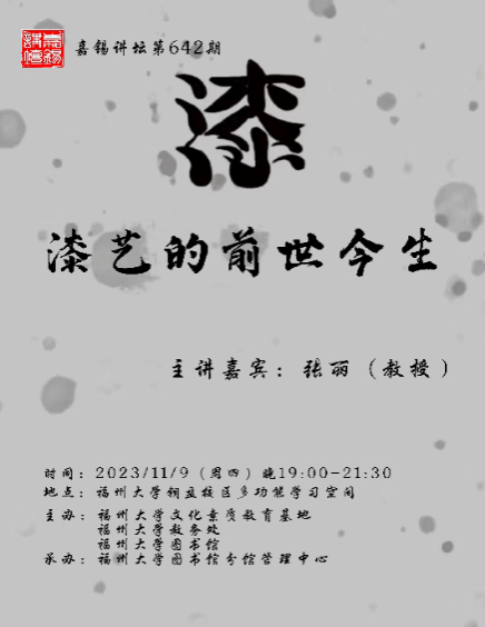 11月9日晚,我院教授张丽应福州大学嘉锡讲坛讲座邀请,到福州大学铜盘校区为福大新生开设以《漆艺的前世今生》为主题的讲座。