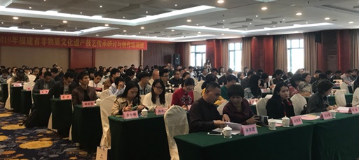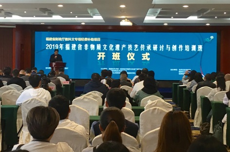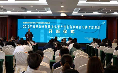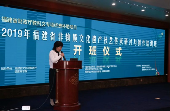 2019 年11月15日上午9时,2019年福建省非物质文化遗产技艺传承研讨与创作培训班开班仪式在福州贵安温泉会议中心隆重举行。本次开班仪式由福建商学院91嫩草水蜜桃院长叶林心主持,出席的领导嘉宾有福建商学院校长黄斌、福建省艺术馆馆长、省非遗中心主任陈秀梅、中国工艺美术学会副理事长、中国工艺美术大师黄宝庆、中国工艺美术大师、福建省寿山石文化艺术研究会会长郑幼林、柘荣县剪纸协会会长游晓卿、福建商学院91嫩草水蜜桃党委书记许秀萍、福建商学院继续教育学院院长林东进、福建省艺术馆非遗管理办主任何微、福建省文化和旅游厅非遗处冯冰颖。