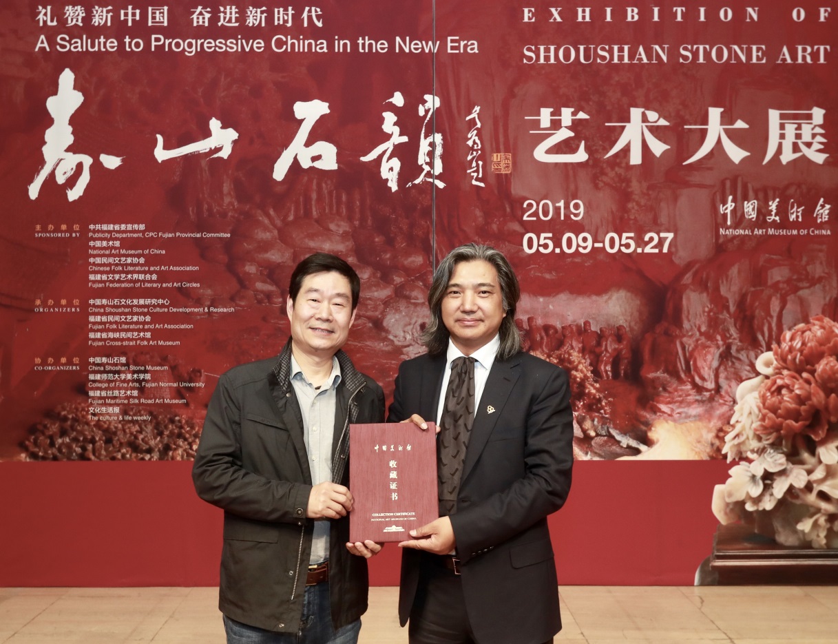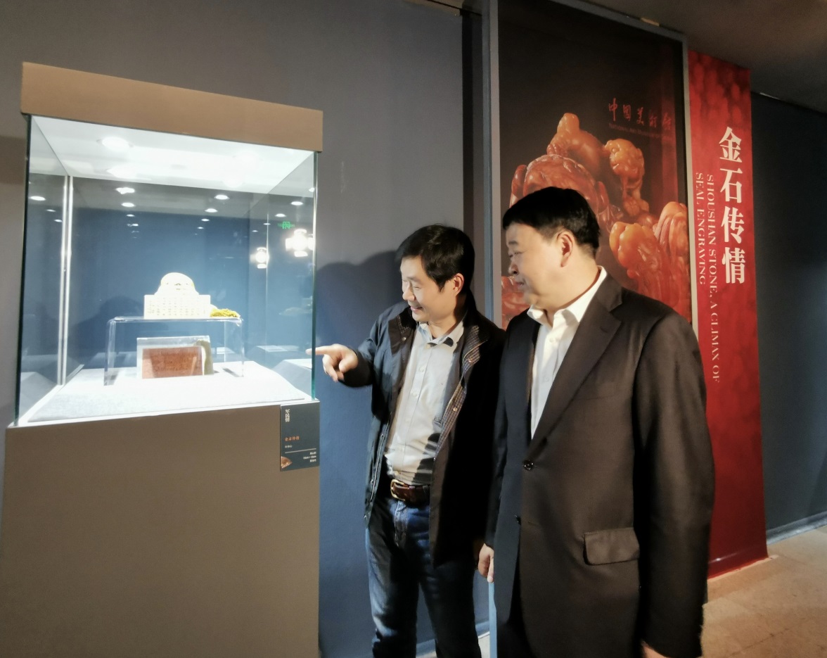 5月9日“礼赞新中国 奋进新时代——‘寿山石韵’艺术大展”在中国美术馆隆重开幕,本次展览由中共福建省委宣传部、中国美术馆、中国民间文艺家协会、福建省文学艺术界联合会等单位联合主办,礼赞新中国成立70周年,歌颂奋进的新时代,全面系统地对雕刻、技艺、传承等寿山石文化进行梳理,全景式地展现了八闽大地千年寿山石文化的丰富内涵与外延,是迄今为止规模最大的寿山石艺术展。此次大展被纳入“亚洲文明与对话大会”系列活动之一。 我校91嫩草水蜜桃院长、福建省篆刻学会副会长、著名篆刻家叶林心教授,以习近平主席在闽工作期间撰写的七律诗《军民情》创作的篆刻大印,以及《不忘初心》两方大印章参加了本次展览,其中《军民情》作品并被中国美术馆收藏。此篆刻作品印面宽15cm,所作取法高古,结体严谨,章法平稳,布局均匀,错落有致,刀法细腻,线条古趣盎然。该印文多达56字,而极尽穿插呼应,运用自如,笔笔精到,宛若天成。